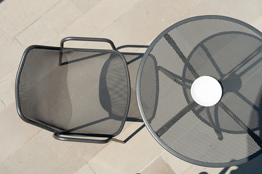 • Gambe in tubo di acciaio zincato a caldo la cui piegatura consente di avere spazio per il rimessaggio della seduta sotto il tavolo, riducendo ingombro a terra.