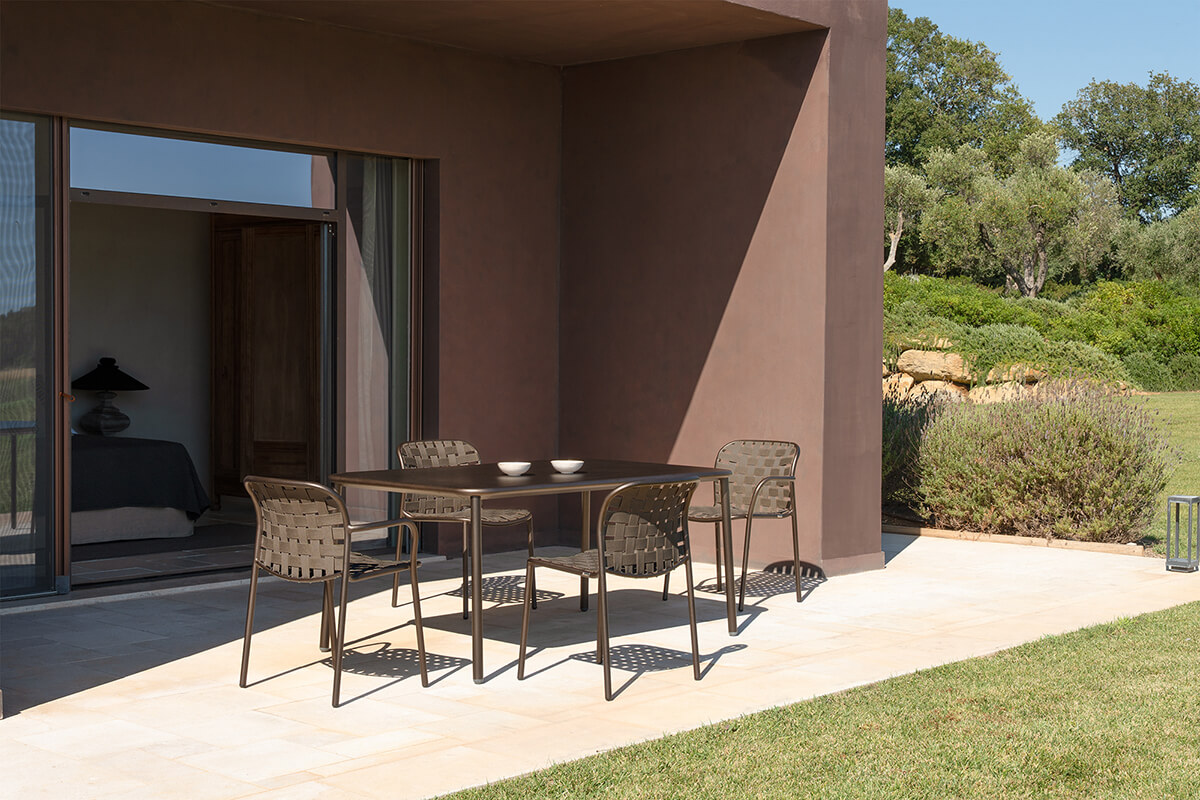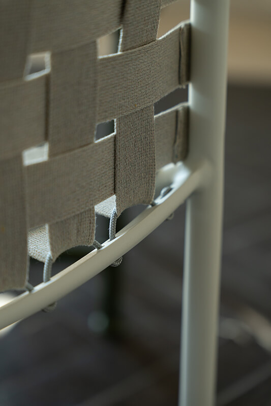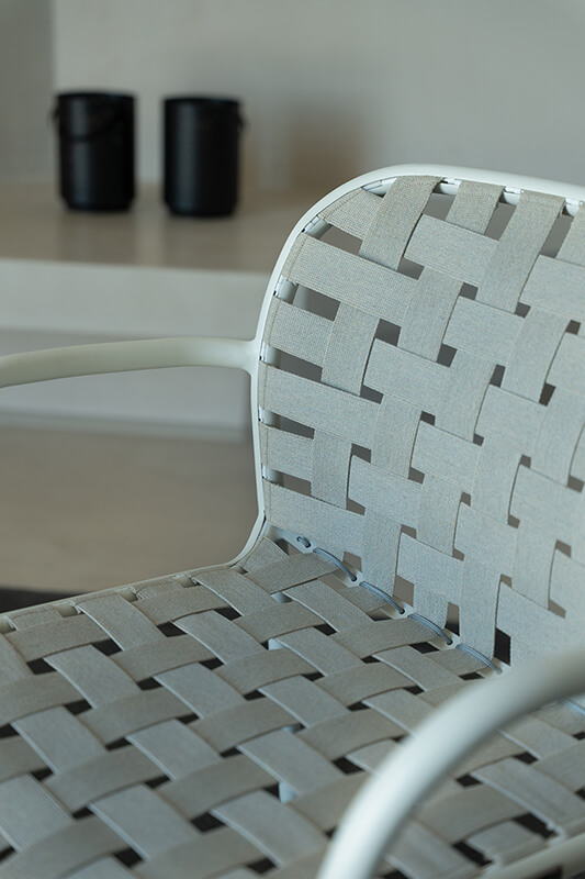 The weave elastic straps, fastened to the sophisticated aluminium frame in an innovative way give life to a collection defined by outstanding, eclectic style and superb comfort, perfectly suitable for outdoor uses. The Yard collection is refreshed with new 100% acrylic straps, which includes 50% recycled fiber, ensuring product longevity and durability. It’s available in a new colour range and the system for weave fixing system to the light aluminum frame has been designed in accordance with the product aesthetics.