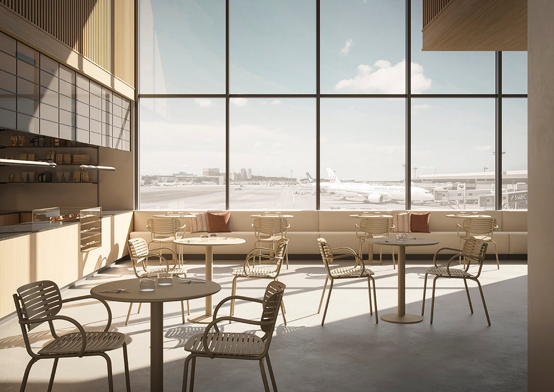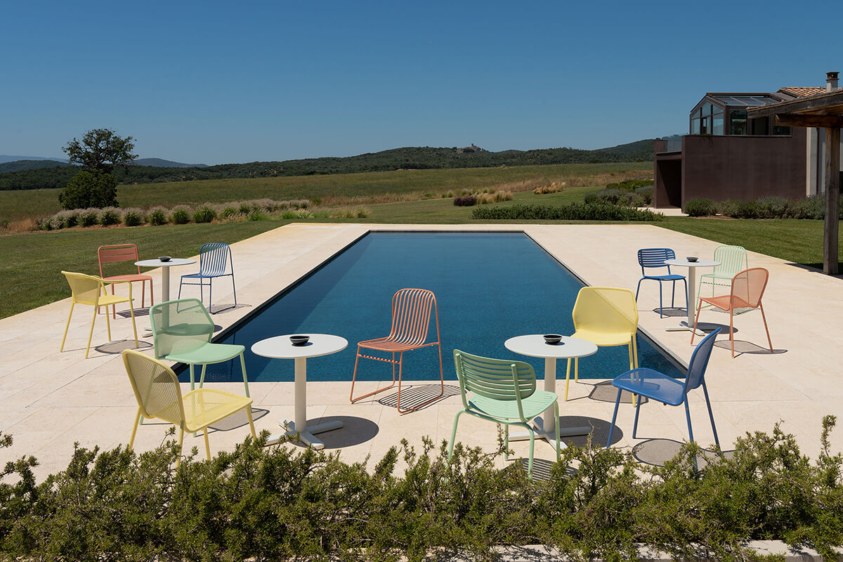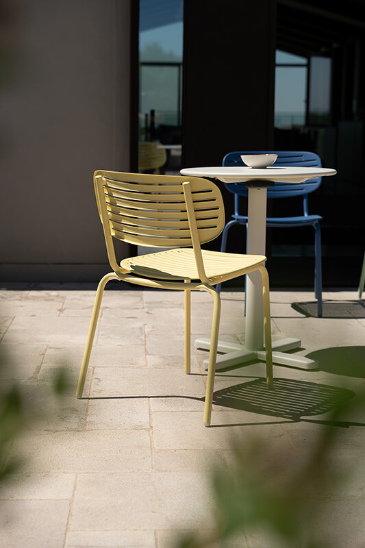 The Mom collection by Coirier is inspired by traditional Japanese trays. The structure is made entirely from Fe360 tubular steel, while the seat and back, characterized by the striking graphic design, are in deep-drawn galvanized steel sheet. Emu-Coat finish (cataphoresis + painting).