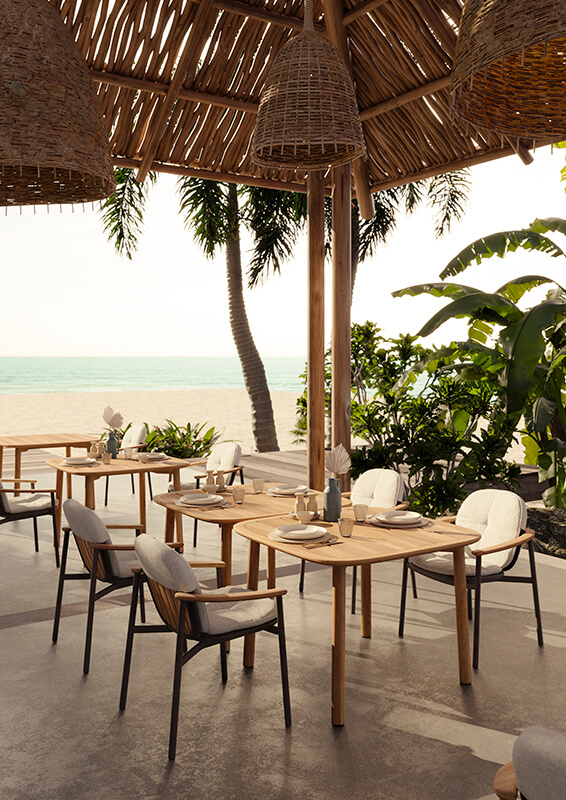 As it is a natural material, it could have different nuances from one product to another or between components of the same product. In case of sudden changes in temperature and humidity, moreover, cracks may also occur. If it does not receive any maintenance treatment with the periodic application of common and specific oil-based protective products, the surface will turn into a silvery-grey finish that can be removed with a light sanding surface and subsequent polishing with an hessian cloth. Small stains caused by oil or other food products must be removed immediately, before the wood absorbs them, by sanding the concerned area and by polishing it with an hessian cloth. Stains from coffee, juices, natural drinks, without food additives, can be promptly removed with water and a soft cloth. When the wood gets wet for the first time, it is normal for the surface to become slightly rough when it dries; the initial polished-effect can be restored with light sanding surface and subsequent polishing with an hessian cloth. Teak is a natural material that absorbs water and is rich in oils. Over time, these oils, by a natural process can rise to the surface and stain the cushions that have been used. Stains on the cushions can be removed using soap and water.